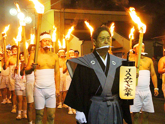 無病息災、五穀豊穣、商売繁盛を祈る「どんと祭」と「裸参り」。1978年、宮城県沖地震からの復興を願い始まった「裸参り」は、白鉢巻、白サラシを巻き白足袋、わらじの装束に身を包み、たいまつを持って参拝します。