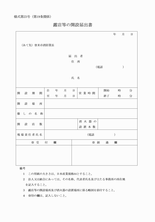 第19条 条例第45条の規定による火災とまぎらわしい煙又は火炎を発するおそれのある行為等の届出は、同条第1号に掲げる行為にあっては様式第8号の届出書により、同条第2号に掲げる行為にあっては様式第9号の届出書により、同条第3号に掲げる行為にあっては様式第10号の届出書により、同条第4号に掲げる行為にあっては様式第11号の届出書により、同条第5号に掲げる行為にあっては様式第12号の届出書により、同条第6号に掲げる行為にあっては様式第23号の届出書により、それぞれ当該行為を行う日の3日前までにしなければならない。ただし、その行為をすることが急を要する場合には、その行為を行う当日までに口頭により届け出ることができる。