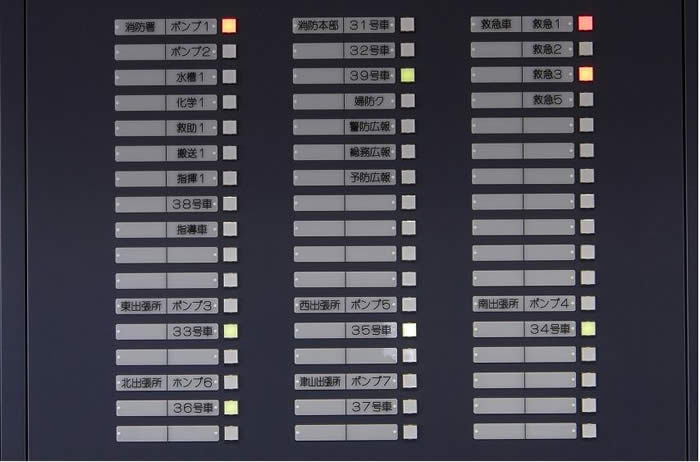 刻々(こくこく)と変化(へんか)する車両(しゃりょう)の動態(どうたい)・位置(いち)を自動的(じどうてき)に管理(かんり)し、出動車両(しゅつどうしゃりょう)の配置等(はいちとう)を確認しながら部隊運用(ぶたいうんよう)を効率的(こうりつてき)に行(おこな)うことができます。